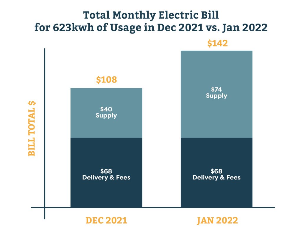 Beginning January 1, 2022, the Standard Offer went up dramatically, from 6.4 cents/kWh to 11.2 cents/kWh, meaning a residential supply bill for 623 kWh of usage went from $40 to $74.
